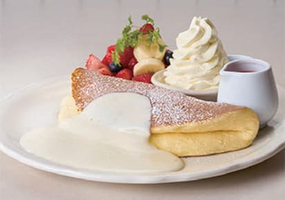 本場アメリカの店舗にはない、日本オリジナルのふわふわパンケーキ。オーダーを受けてからメレンゲを泡立てて作るので、ふわふわな食感をお楽しみいただけます。自慢のホイップバターと自家製メープルシロップが素材の味を引き立てます。